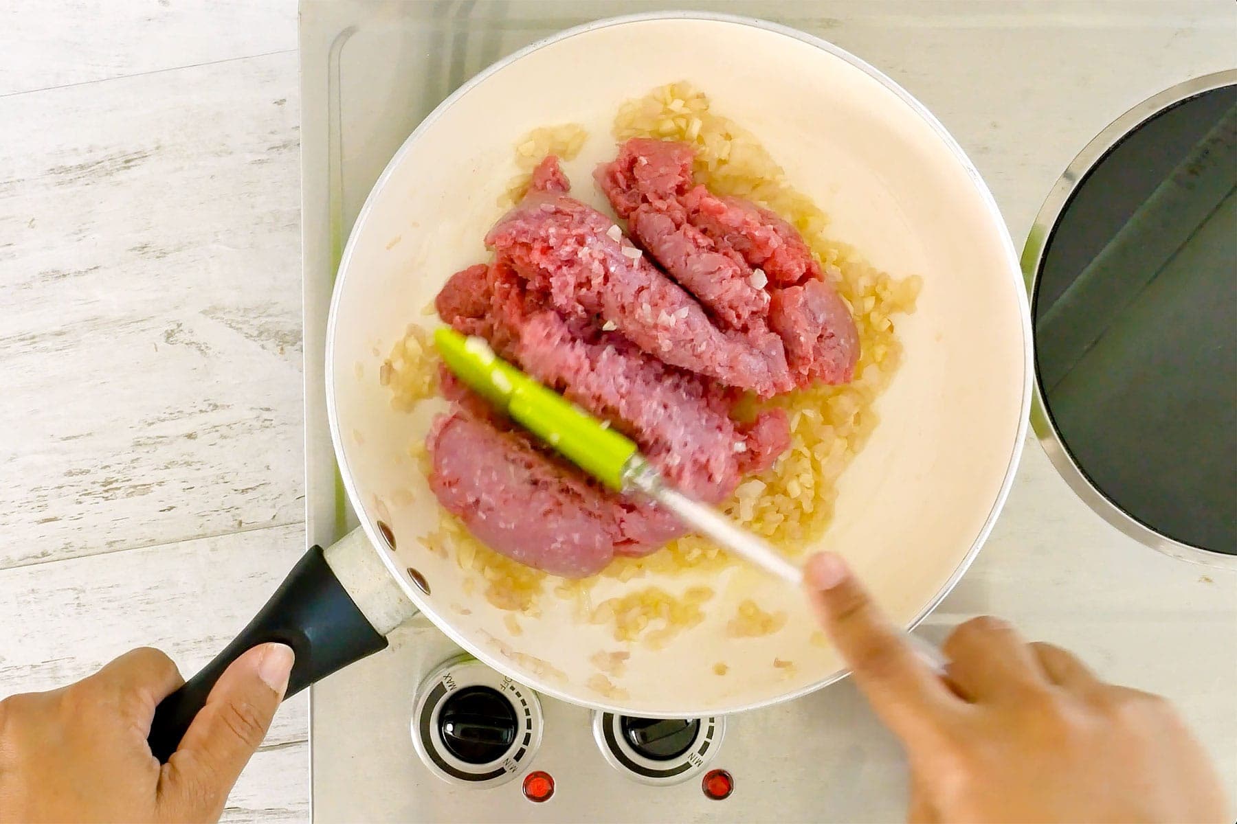 - In a large skillet, heat oil over medium-low heat. Stir in onion and cook and stir until it turns translucent. Add garlic and cook and stir for a minute.Add minced meat and cook and stir, breaking it into small clumps until it browns.