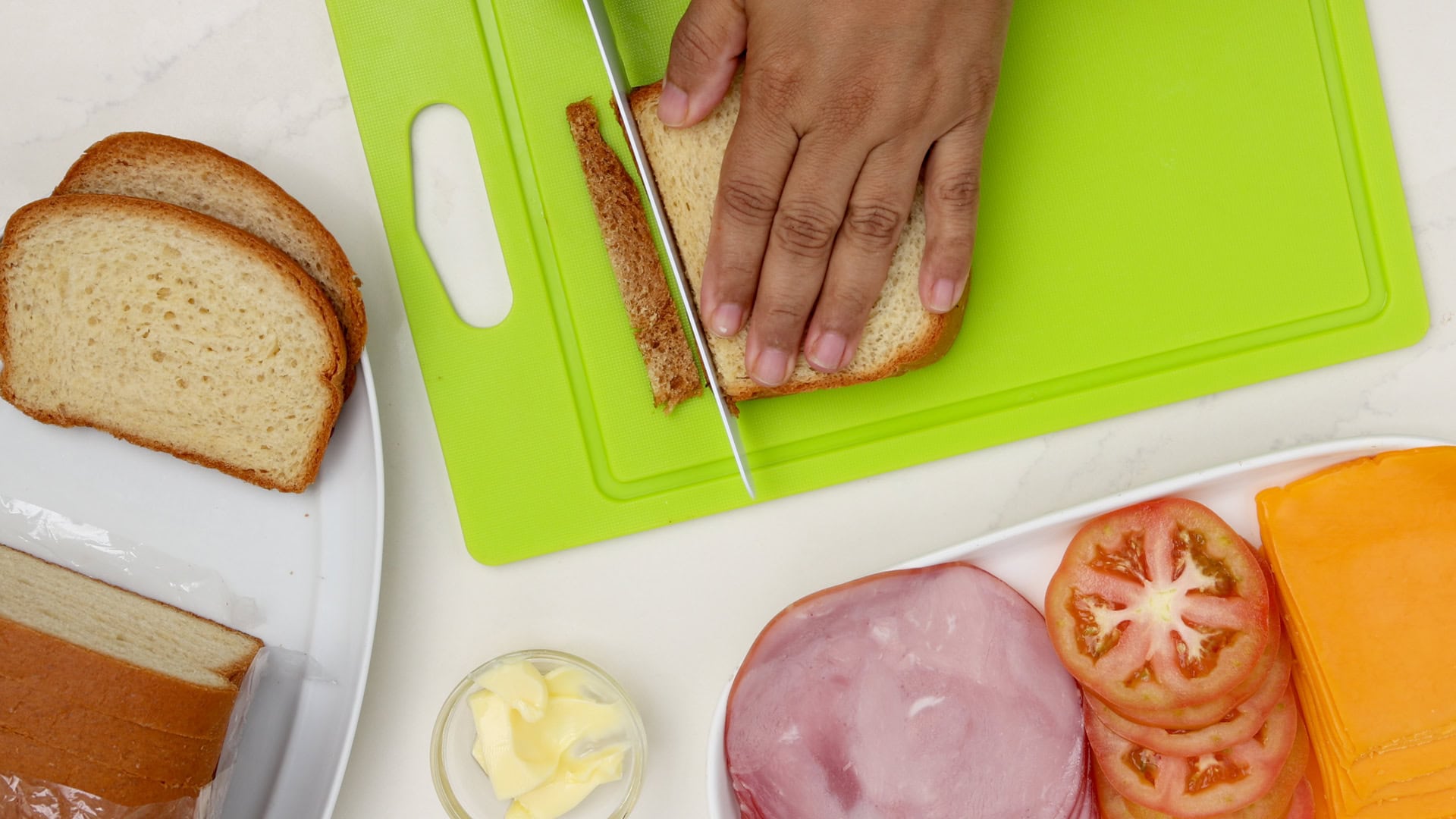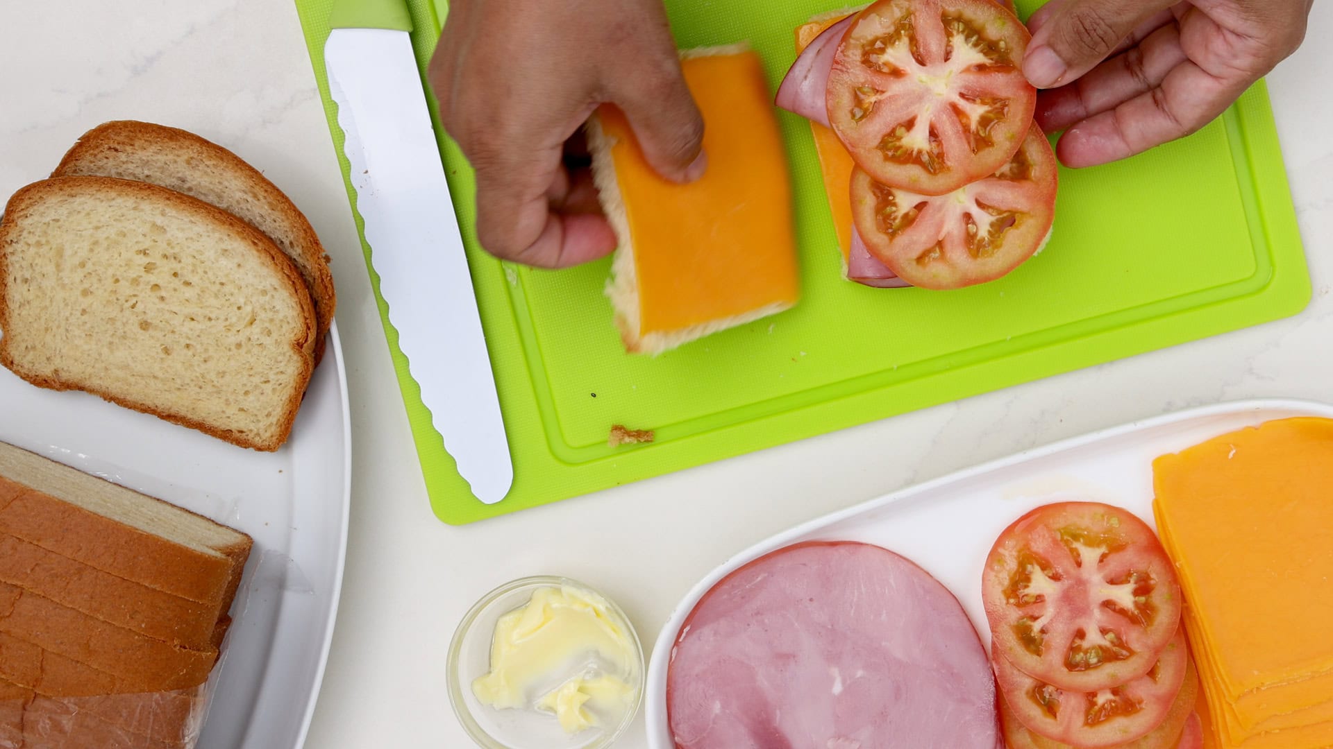 - Spread each slice of bread with butter on one side. Top that side with a slice of cheese.Top one slice with ham, tomato, and onion (optional). Put both halves together.