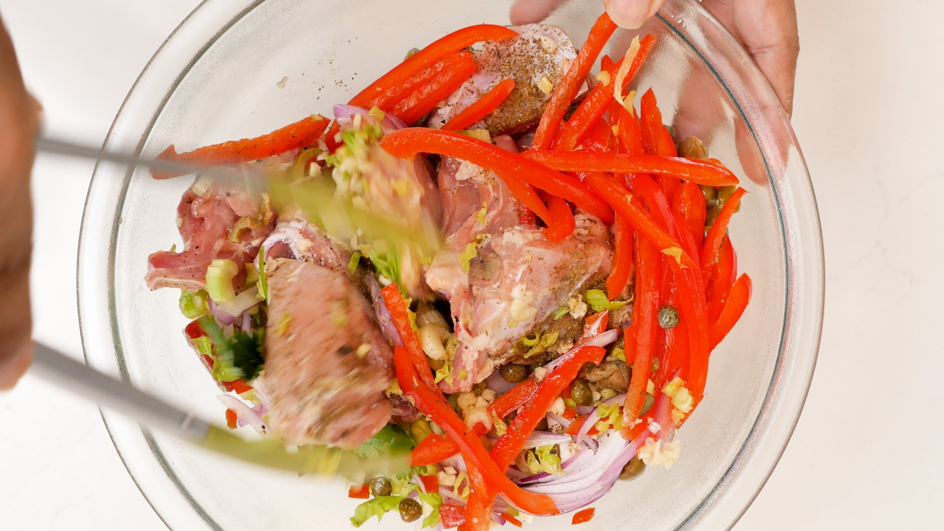 - In a bowl combine chicken, salt, oregano, cilantro, pepper, bell pepper, onion, celery, garlic, capers, olives, and lime juice. Mix well, and let it rest for 30 minutes.