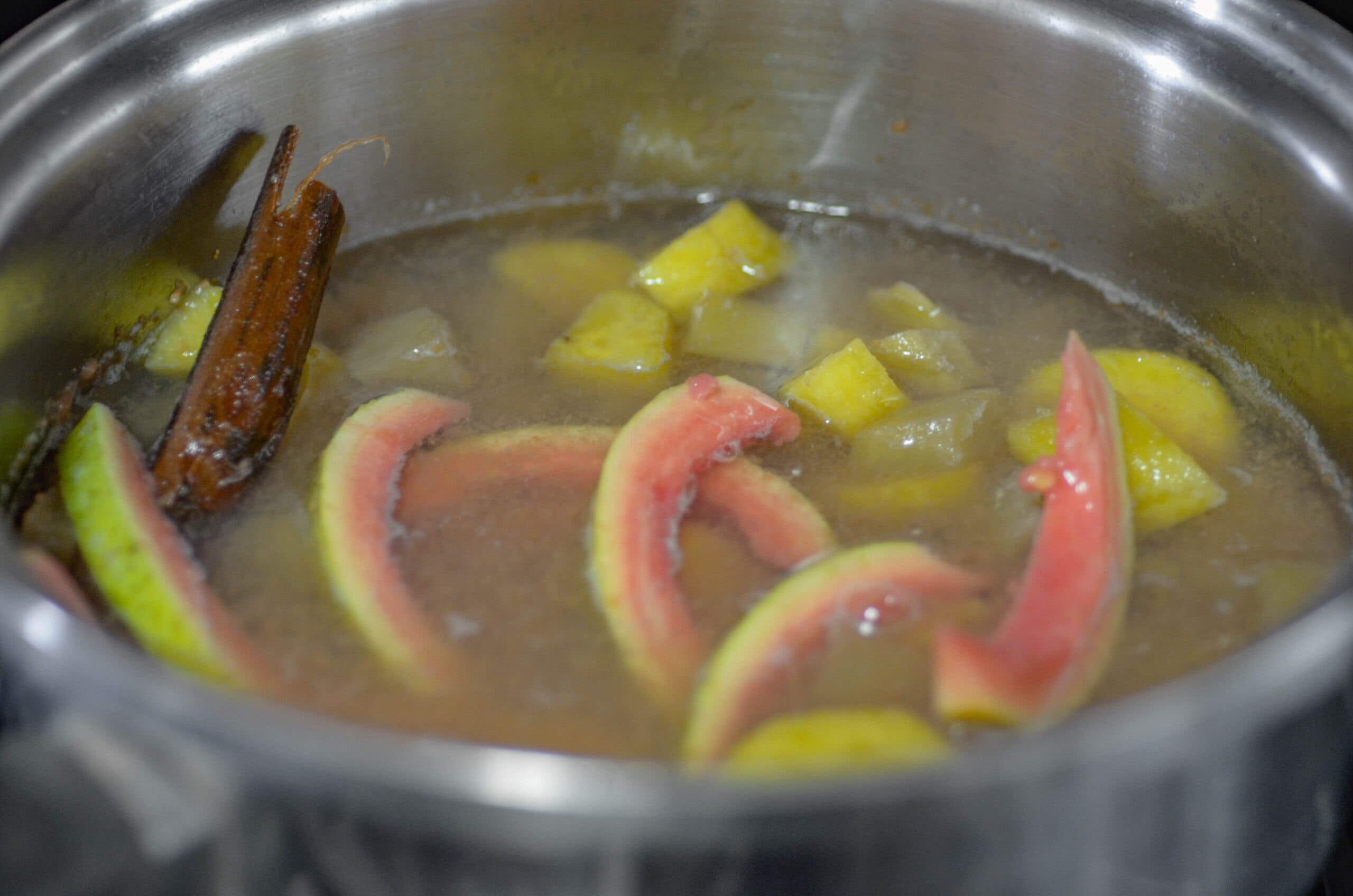 - Pour the liquid back into a pot and add sugar, plantain, and sweet potato.Boil over medium heat until all the ingredients are cooked throughout. Add water as it becomes necessary to maintain the same level of liquid.Add the guava wedges and boil for another five minutes, let enough of the liquid evaporate to obtain a light syrup.