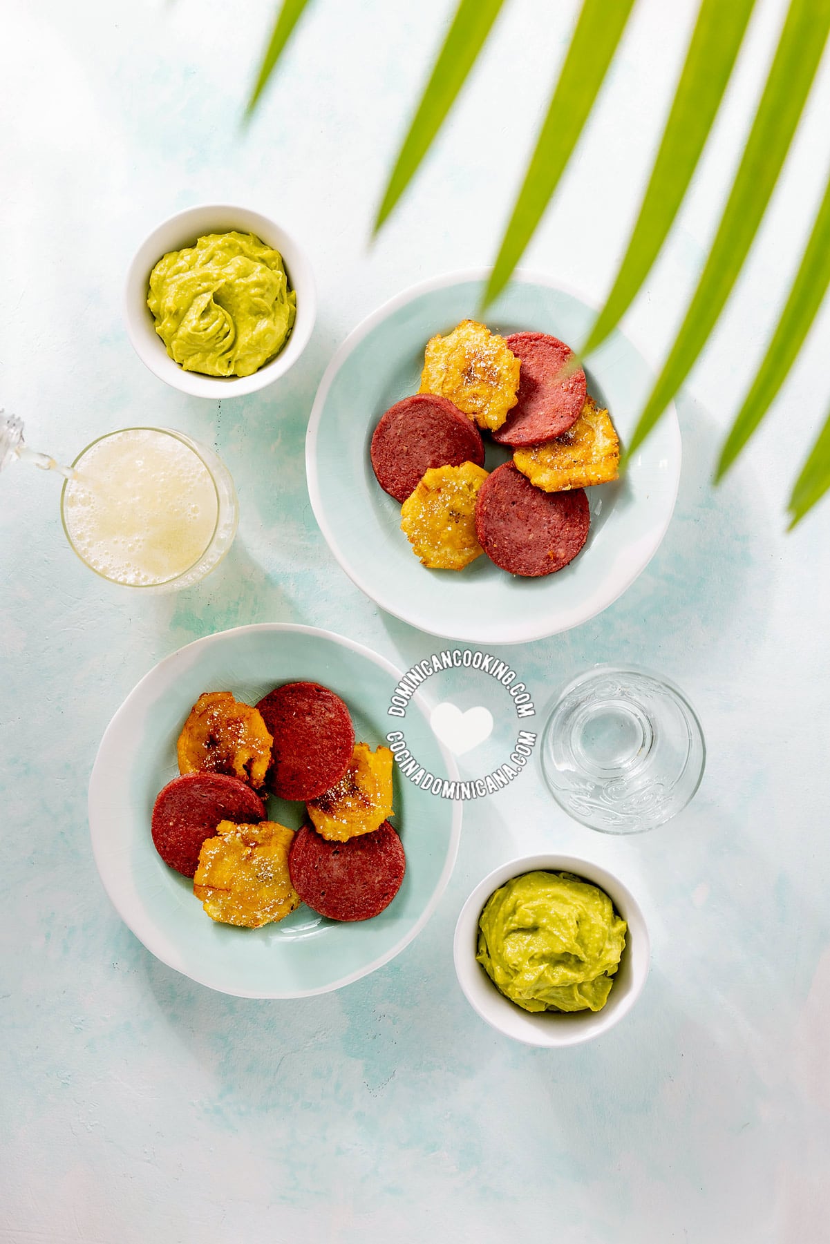 Two of our most humble and beloved foods, Fritos con salami dominicano, can be served as an easy, tasty snack or even as a quick dinner. Tostones (twice-fried plantains) with fried slices of Dominican salami sausage are the kind of indulgence we sometimes partake in.